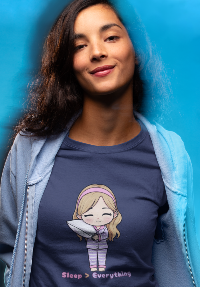 Introducing the ultimate tee for all the nap queens and sleep enthusiasts out there—the “Sleep Over Everything” tee. Ideal for those lazy Sundays or cozy movie nights, this shirt promises to be a delightful addition to your loungewear collection. Made from soft, breathable fabric, this tee offers unparalleled comfort and style, perfect for anyone who reveres the fine art of relaxation.